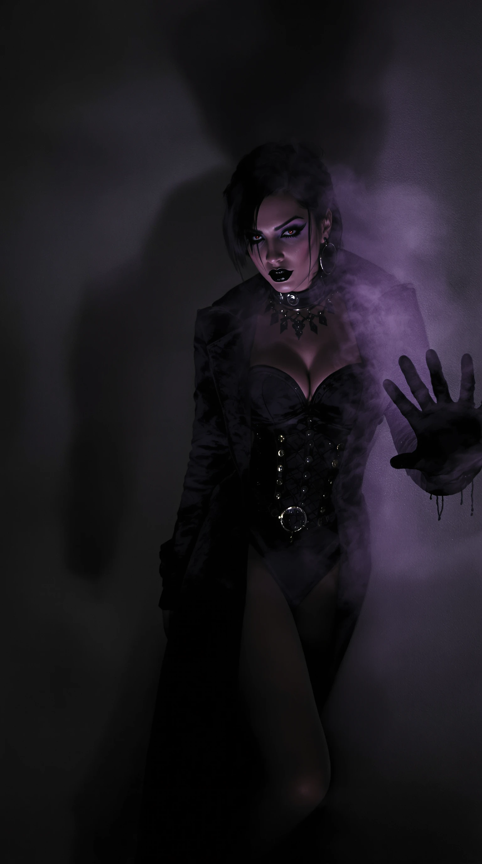 lazyup, lazympos, masterpiece, masha_character, three-quarter body, gothic rock superheroine in black velvet coat and corset, phasing through wall with ghostly mist effect, dark moody lighting, violet and gray tones, realistic cinematic glow, stylish pose, detailed lighting and texture