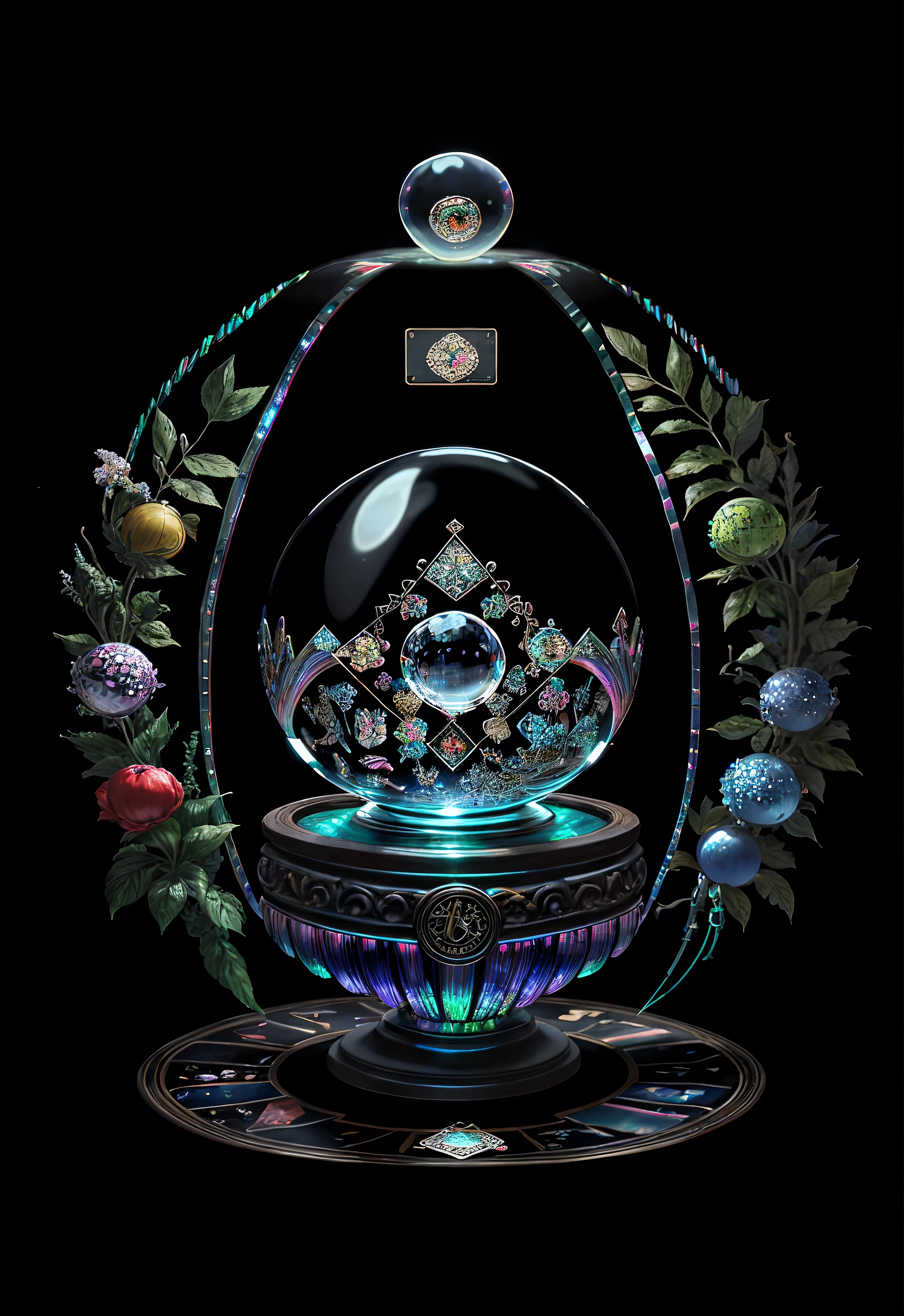 (best quality, top quality, masterpiece) , illustration, official art, beautiful and aesthetic, intricate details, ultra detailed, (iridescent translucent crystal ball:1.5) , alluring fortuneteller, plants, flowers, (tarot card, wheel of fortune, flourish pattern) , abstract background, <lora:add_detail:0.33> , <lora:noline:-0.33> , <lora:pastelmix-lora:0.33> , 16k, UHD, HDR, (Masterpiece:1.5) , (best quality:1.5)