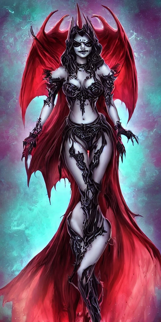 person = barbara palvin as undead necromancer lich. looks =dark straight hair, feminine figure, gorgeous, pretty face, beautiful body, wings, beautiful symmetrical glowing red eyes, two beautiful smooth silky legs:: pose = arms around body, Dragon with Massive Wings spread completely behind back:: shape = dance pose, curvy body, anatomically correct and fully showing symmetrical female chest, anatomically correct female torso and belly button, complete smooth pretty human arms and fingers, symmetrical face. clothing = revealing outfit, A pair of wearing a ivory breastplate and full-body-jewelry harness made from ice jewels :: environment = cemetary with frost aura ::details = highly detailed clothing, clear face that is fully shown, hyper quality style, top shelf jewelry with jewel arrays = dark fantasy, realistic, full female-body shot, both lower and, upper lips are completely down in clear detail, 3d printed:: artist = cgsociety, artgerm, trending on artstation, by victor titov. --video --s 3250 --seed 909101793 --ar 10:18 --q 1. 5 --no amputees --no blur DOF --no fractals --v 3