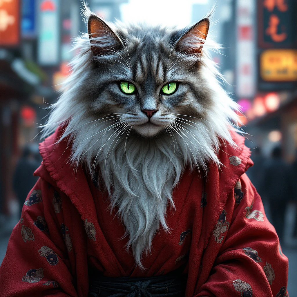 a maine coon cat yakuza wearing futuristic scifi green eyes, light grey face hair and zen robes, hyper-realistic masterpiece, mystical cyberpunk city street