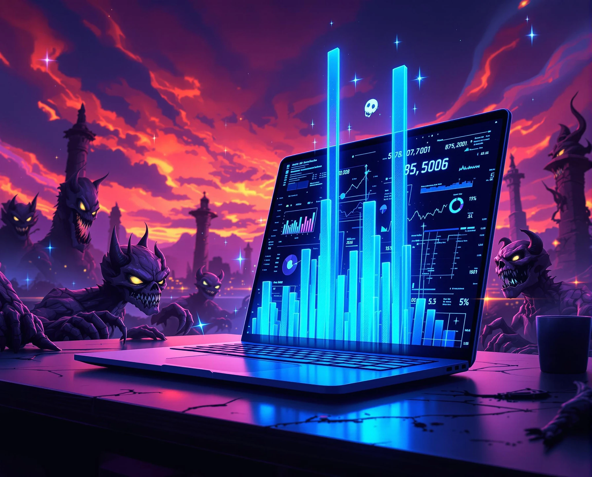 highly detailed, exaggerated expressive features, Image is a ultra-detailed dark, retro gothic cartoon fantasy illustration depicting a dynamic, high-tech motion scene: A sleek laptop opens on a dark desk, its screen lighting up with vibrant data visualizations—glowing blue bar graphs, pie charts, and line graphs animate into view. Blue bars rise up from the keyboard as if projecting upward in 3D. The background is a rich, deep purple with flowing abstract digital lines, binary codes, and a faint animated world map overlay—pulsing subtly to represent global data connectivity. Lens flares and light pulses add energy. The camera slowly zooms in on the screen, emphasizing real-time analytics and digital transformation. Ideal for big data, business intelligence, or futuristic tech themes. anthropomorphic Demons, decaying beasts, ghosts and ghouls roam . The sky is a blend of dark necrotic orange, midnight blue, and odious pink purple hues, adding to the spooky and gothic ambiance of the scene. Perfect forms, precise anatomical physiognomy, bilious necrotic backlighting