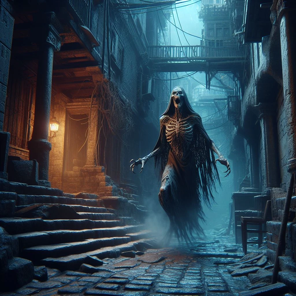 fantasy and terrifying Banshee at night, in a dilapidated, ancient alley, intricately detailed. , photorealistic, octane render, unreal engine, hyper detailed, hdr