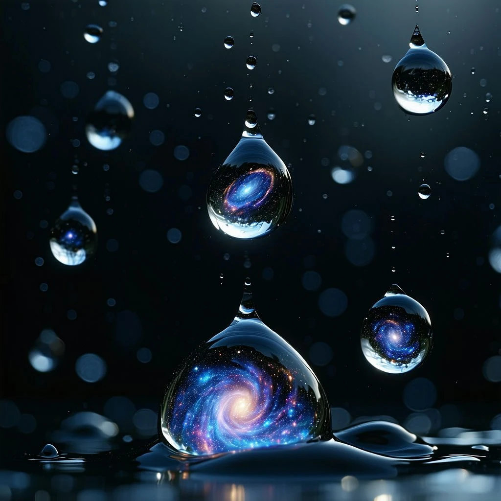 Capture a hyper-realistic, high-contrast macro photograph of a raindrop falling to the ground with a galaxy inside the drop. The image should feature other raindrops falling around it, each with a different shaped galaxy inside, against a dark background. Your goal is to create a visually stunning and detailed composition that emphasizes the unique galaxies within the raindrops and the dynamic nature of the scene. The photograph should be in 16:9 aspect ratio, with a size of 750 pixels and a high level of detail.