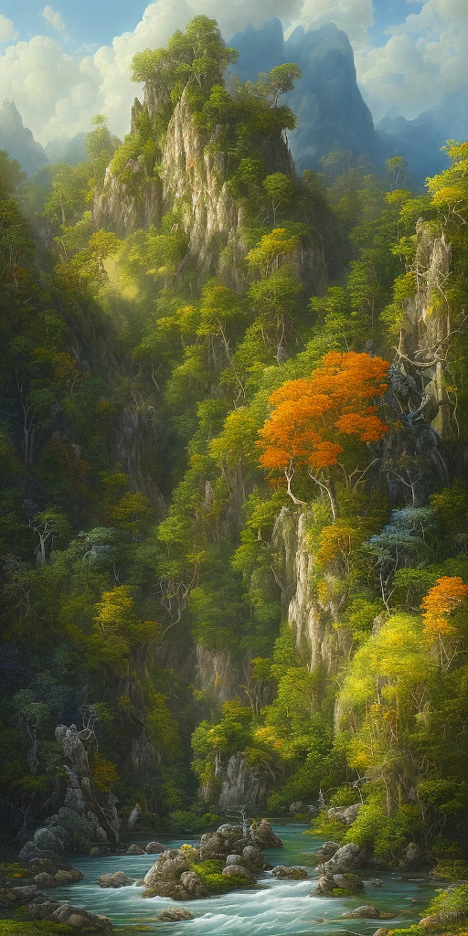 an endless mountain range on the background, covered full with lush green forests and life, blue sky with expressive but formless clouds and stars, a swirving river with clear water reaching out to the front of the scene, in the style of atmospheric paintings, the painting is colored in orange, black and yellow, in the style of complex compositions, dark white and light red, circular abstraction, dmitry spiros, industrial materials, with tones of gray, black, green dark indigo and light cyan, aquamarine blue and white, lovely mind-bending sculptures, realistic hyper-detail, in the style of complex compositions, dmitry spiros, balanced proportions, hard edge painting, fluid simplicity --ar 63:128 --stylize 750