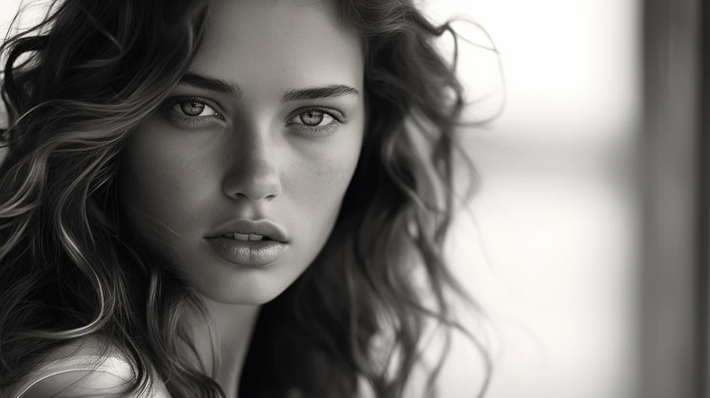 a black and white photo of a beautiful young russian woman , wavy brown hair, sultry, sexy, facing camera, realistic skin texture, rule of thirds, elegance, sharp focus, fine detail, Annie Leibovitz, --ar 16:9 --style raw