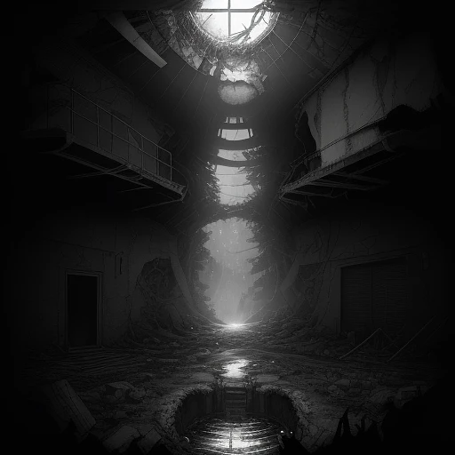 A detailed black-and-white manga-style illustration set in the universe of "The Last of Us. " The scene is inside a collapsed sewer system, with a dark gray filter to emphasize the mood of despair and desolation. The environment should reflect the gritty, survivalist nature of the series, featuring a rainy, gloomy atmosphere