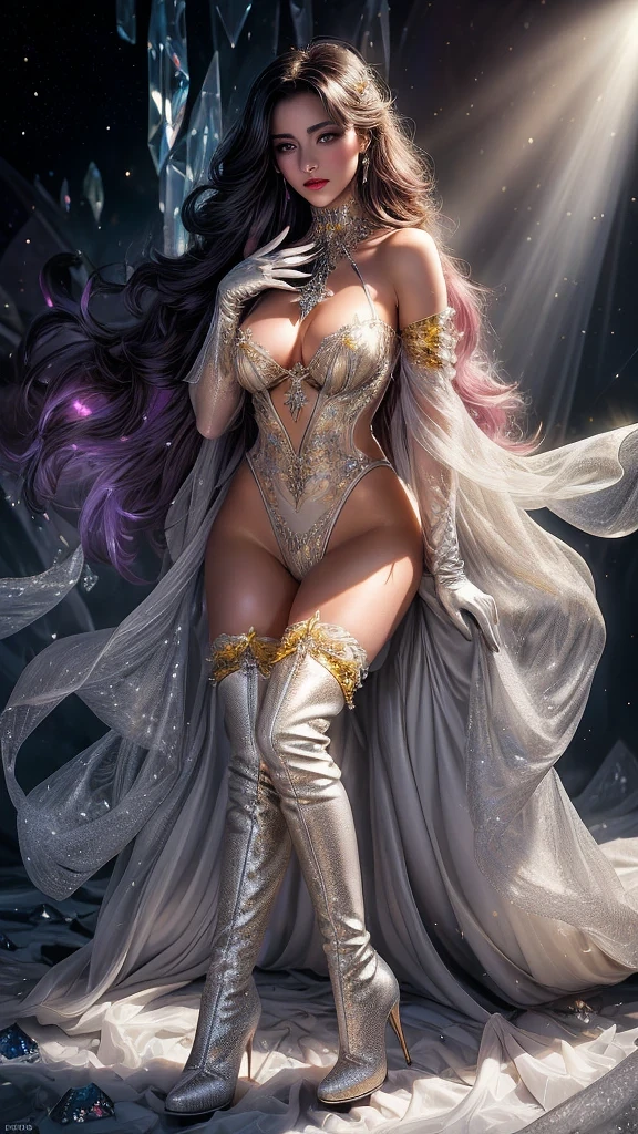 8 k Photo of an erotic, very young and magical woman in a diamond lingerie with yellow crystals, erotic, dynamic light, ultra-realistic, stocking overknee boots and overarm gloves, 8 k, ultra-detailed, intricate, in a crystal world, glimmer and glitter, upskirt, cameltoe , very beautiful body and face, very seductive erotic make-up and coloured fingernails, different modelpositions , masterpiece, award winning photography, ultrarealistic, photorealistic