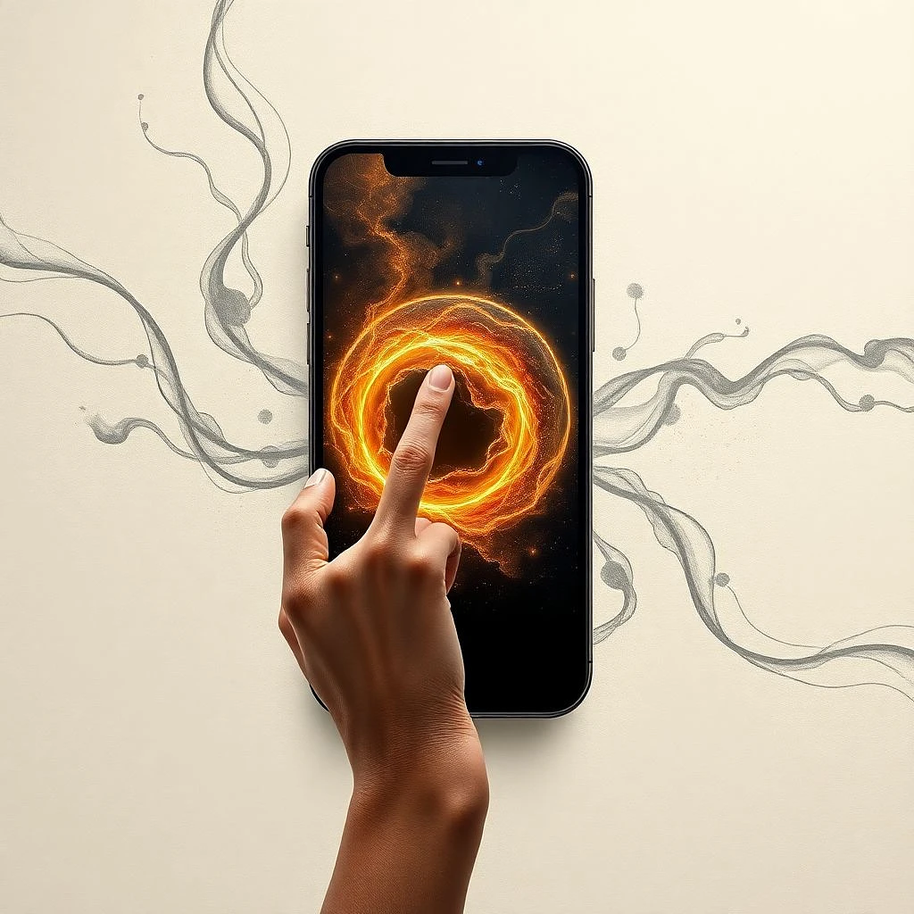 Create a stunning AI-crafted wallpainting in the style of Michelangelo, inspired by his famouse artwork "The creation", depicted on the ceiling of the Sistine Chapel in Rome. Showcasing a hand reaching into a dark, swirling, cosmic orb on an iPhone. The iPhone displays a sphere, reflecting a stylized nebula of shimmering golds, oranges, and browns. The swirling energy within the orb suggests a celestial event, possibly a supernova or a galactic core. The photorealistic hand is delicately positioned, with a fingertip touching the swirling, fiery center of the depicted universe. The backdrop is a light beige wash, dotted with scattered, stylized flags of USA, Russia, EU, China, AirPods + Case and a white ligthning cable. impressionistic, gray-toned, flowing lines, evoking a sense of vast space and ethereal energy. The image has a dreamlike, slightly abstract quality, a blend of realism and impressionism. The overall color palette is warm and dynamic, creating a sense of wonder & myster. Latin title reading "De creatione"