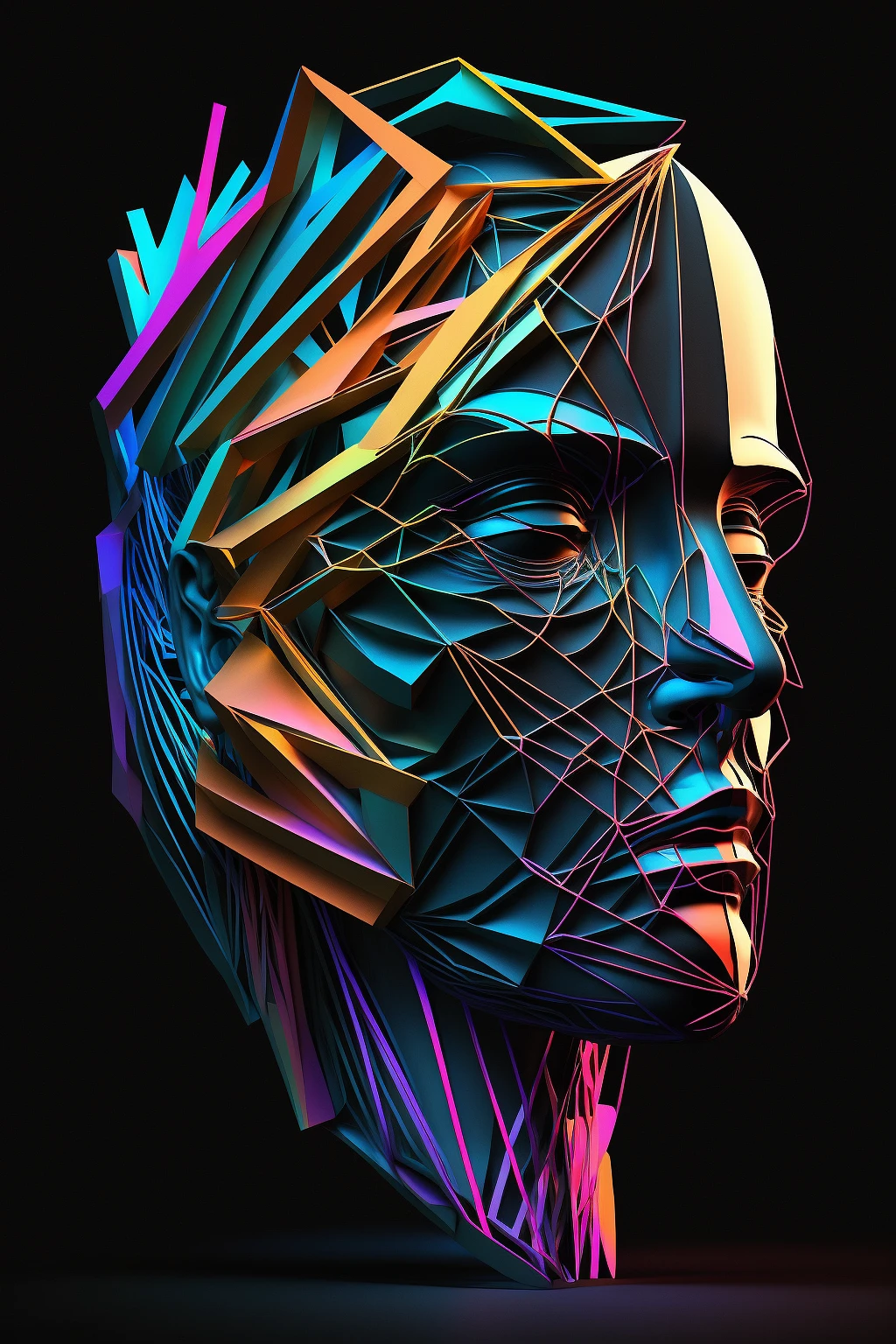 An abstract 3D sculpture of a human face, made entirely out of geometric shapes and lines. The piece is rendered in neon colors, with a dark background to make the shapes stand out. The sculpture is highly detailed and intricate, with a futuristic vibe. --ar 2:3