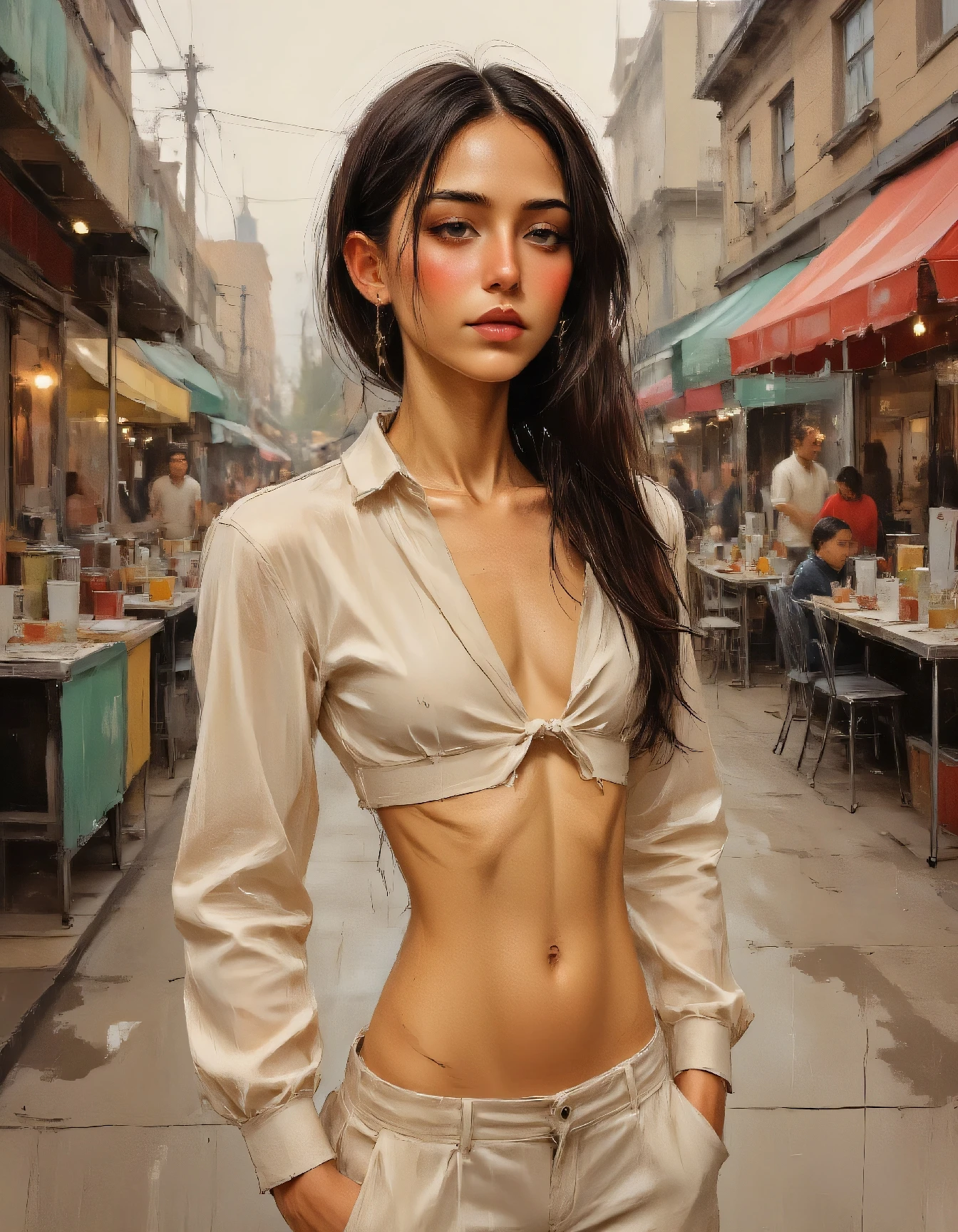 Watercolor-inspired digital painting Loose, impressionistic backgrounds. Contemporary digital illustration style: This represents modern digital art that's popular in concept art, character design, and online illustration communities - combining traditional artistic techniques with digital tools to create polished, commercially-viable artwork of a 24-year-old Kanak-Cherokee female chic minimalist with a warm and inviting expression. She has Pale skin with visible veins, giving a translucent appearance. The skin pores and texture are clearly visible and in focus. Her Cat eyes, Deep-set, grey eyes, framed by long, elegant eyelashes. Her haircut is Side-swept curls, haircolor is . Her eyebrows are Groomed arch shaped, complementing her delicate facial features. Her body is Firm, toned triceps with a sleek contour, small breast, toned abs, anorexic. Her upper body clothing is Cropped functional sleeve jacket, slightly open, Her midriff is clearly visible, Her lower body clothing is Low-rise gaucho pants with wide legs and maximum midriff exposure. She is positioned on the left side in the frame by the rule of thirds. She strikes a pose with hands in pockets, leaning slightly to one side, creating an easy-going, stylish look. . In the background A crowded flea market with eclectic stalls selling vintage clothes, antiques, and handmade crafts, offering a quirky, vibrant background full of textures and patterns. . The The lighting is diffused and warm, creating a dreamy, almost ethereal quality. The colors seem to glow and blend into each other, enhanced by the watercolor-like transparency effects. The overall effect is romantic, contemplative, and visually striking, with a professional quality typical of contemporary digital illustration work.