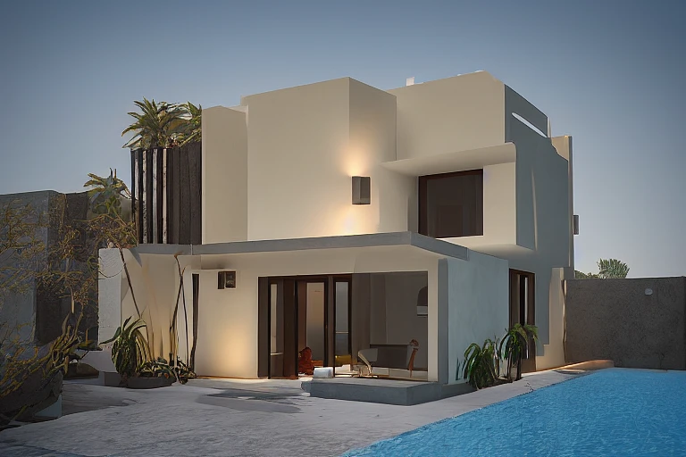 very small modern villa, cubic architecture, Bauhaus style mix to Islamic architecture, Isfahan, ochre concrete, detailed, ultra-realistic, unreal engine, beautiful lighting, stunning desert environment, post-processing, 8k octane, de-noise, golden hour