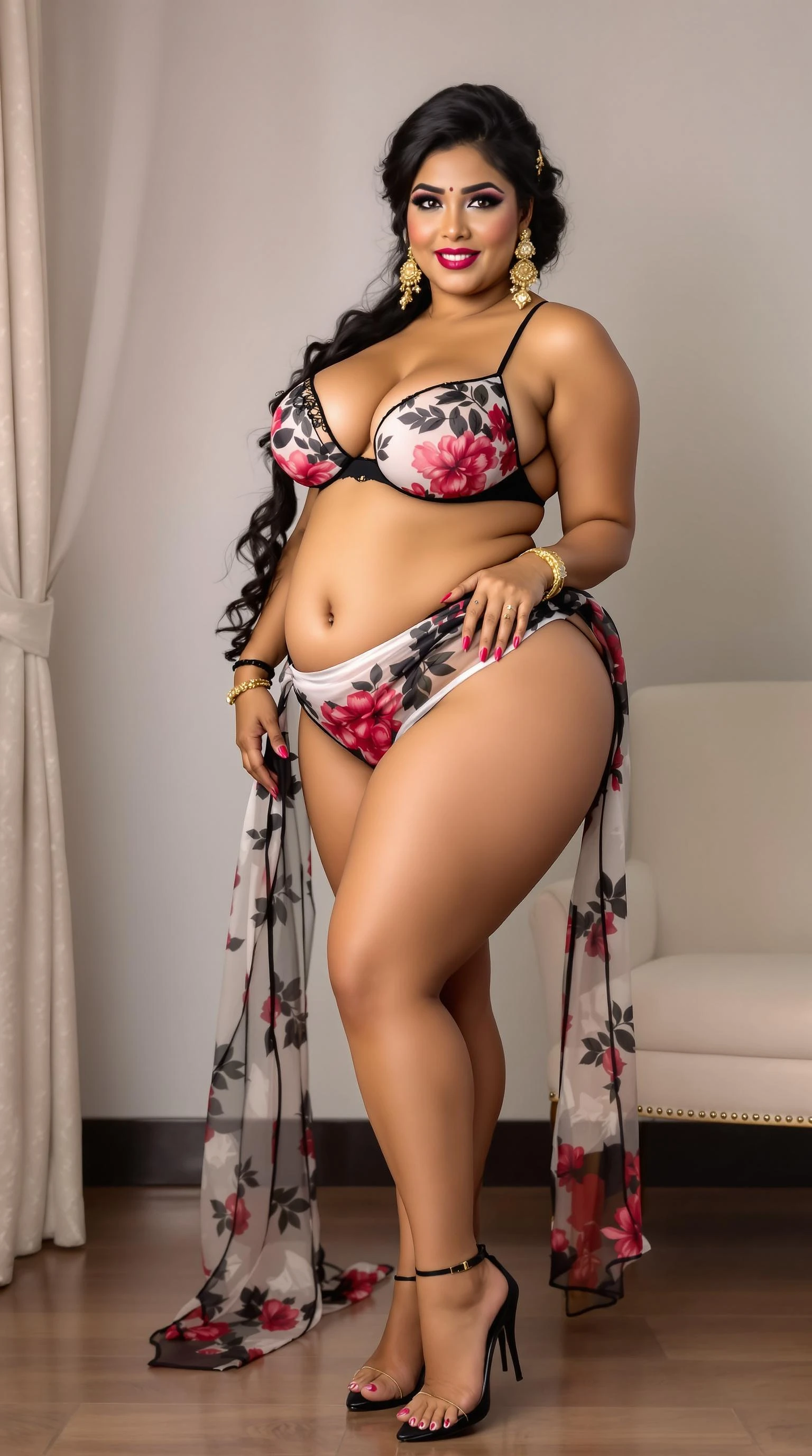 a full side front view large puffy boobs beautiful black eyes plus size legs with high heels matched color cleavage realistic looking Sexy Indian plus size sexy white Indian woman with sexy smiley face a Indian hot and sexy standing on her front cleavage she is with transparent black red and white very thin transparent scarf on boobs see through rear of bra and tiny while panty , capture the delicate contours of her face and the intricate details of her classic hair style black vibrant colors to capture the intensity of the flowers, her hairs styles Gorgeous Cupcake Hued Bun-Style Bridal Hairstyle, she is laughing out loud sexy, she is looking at her back with smiles see through side hip view