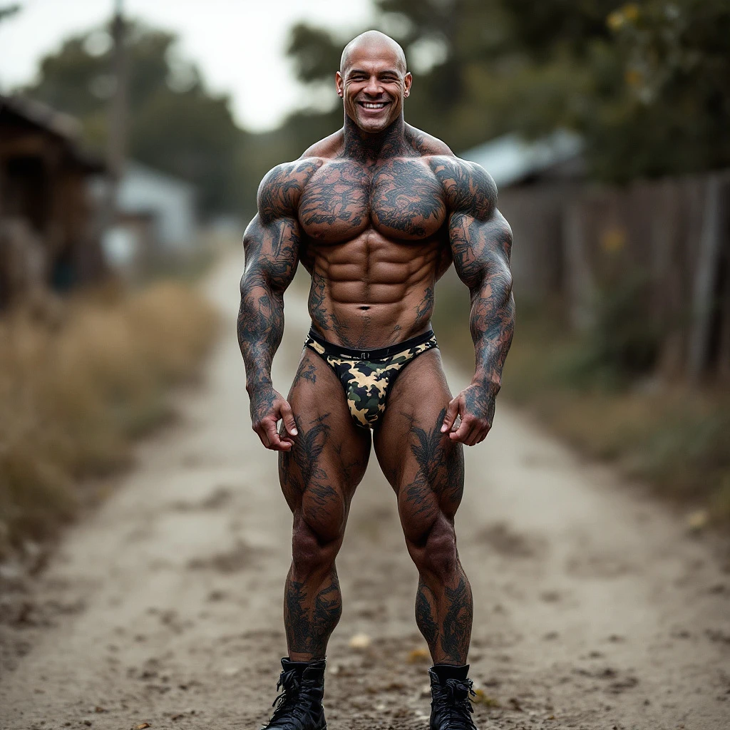 Full body image, tall fit slim bodybuilder, heavily tattooed, slim face, chiseled jawline, shaved head, big dick in camouflage print thong underwear, big feet in black combat boots, big smile, standing outside on dirt road
