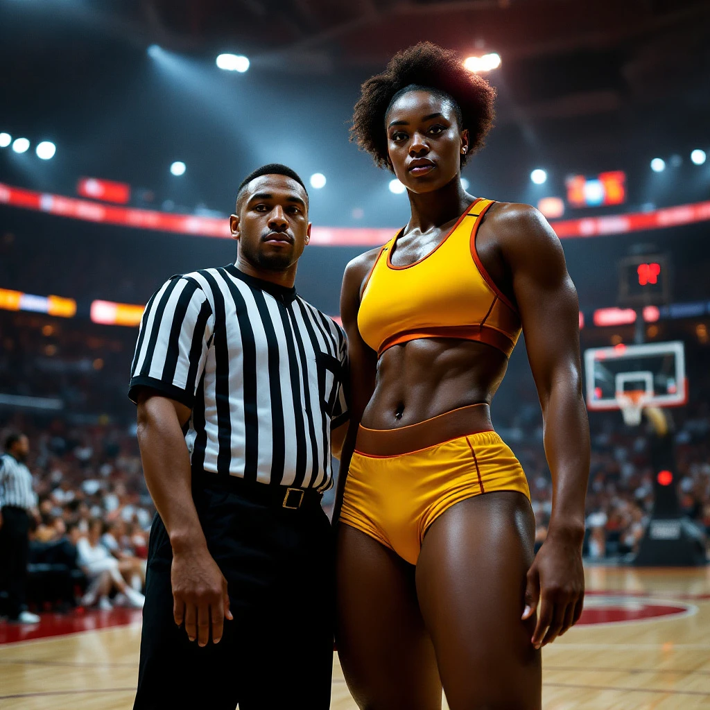 full photo of An 10 ft tall confident heavily built black African female basketball player in a sleek sports bra and fitted athletic tight female athletic boxers stands poised mid-court, her muscular frame glistening with sweat under the bright stadium lights. A white male 4 ft tall referee stands by her side both posing for a photo looking directly at the camera the camera is at a low angle . the photo captures them full from head to toe angle . The polished hardwood floor reflects dynamic shadows , surrounded by the vivid red lines of the three-point arc and distant cheering crowds blurred in the background. , cinematic shot, dynamic lighting, 75mm, Technicolor, Panavision, cinemascope, sharp focus, fine details, 8k, HDR, realism, realistic, key visual, film still, cinematic color grading, depth of field