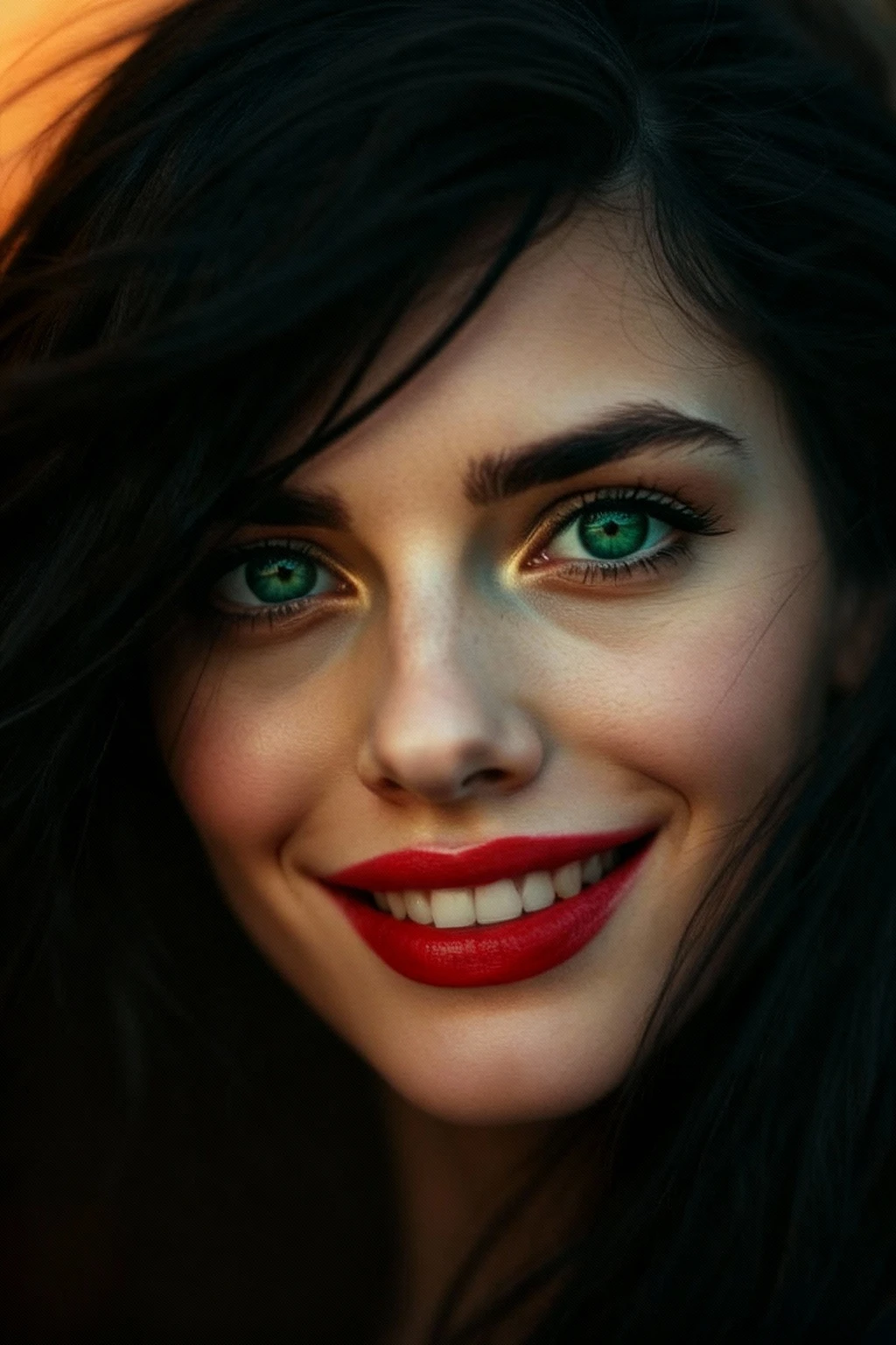 "Fine art photography featuring a supermodels face in close-up, swirling fog with vibrant, warm colours, under soft, dark, professional lighting. She has light skin, raven black windswept hair, expressive vivid emerald green eyes, parted red lips, cheeky smile, editorial style. "