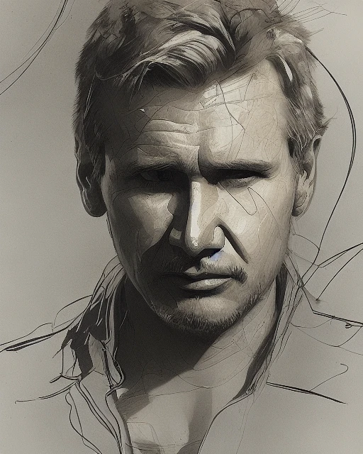 portrait of a mix of Harrison Ford and James Dean sechan, pen and ink, complex line drawings, by craig mullins, ruan jia, kentaro miura, greg rutkowski, loundraw