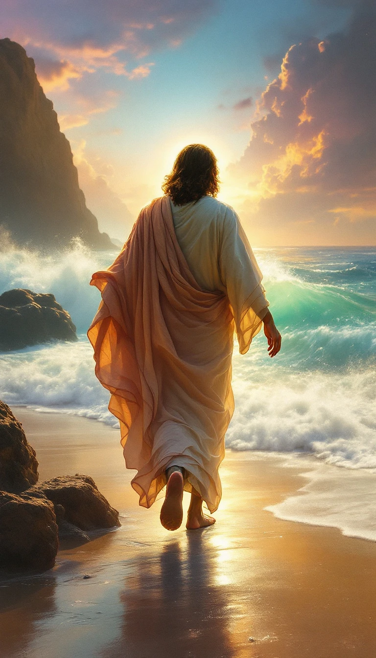 Jesus walking on the beach from the back, not walking on the sand, next to the beach next to the water. The perspective will be from behind Jesus as he walks along the beach. Move it a little closer to Jesus so it takes up more space in the frame. In the following example you can see one of the palms of his hands and you can see the sole of one of his feet. Paint a small hole clearly visible in the center of her hand and in the center of her foot she has holes in her hands and feet where nails would have been pierced but light appears in her. background and an ethereal aura, featuring radiant colors and intricate details in a digital format with vibrant hues. The god is depicted with flowing robes and a majestic presence. --ar 71:128