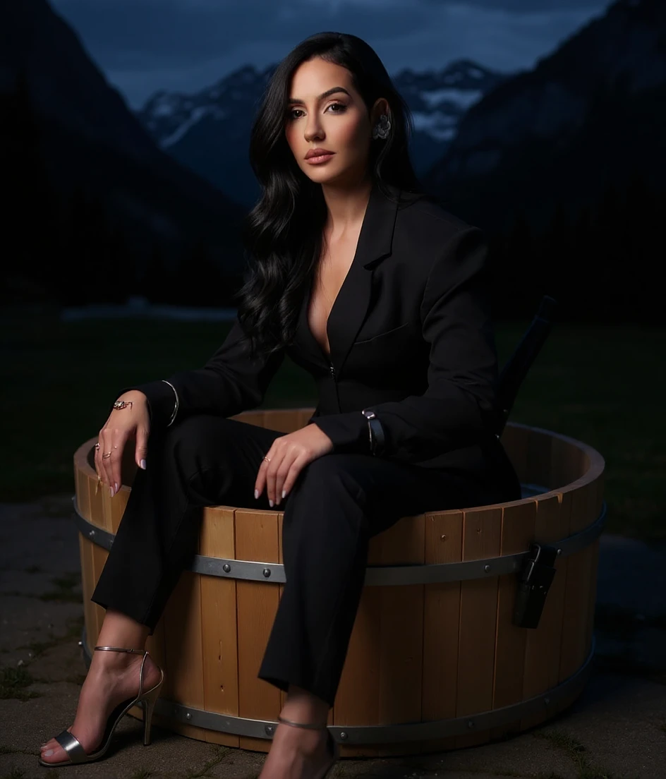 full body portrait woman a powerful and dignified portrait , gorgeous female sitting in wooden hot tub jacuzzi, attractive, flirting, mountains in background, nature, (((full body visible) )), looking at viewer, portrait, photography, detailed skin, 8k, highly detailed, full length frame, High detail RAW color art, piercing, diffused soft lighting, shallow depth of field, sharp focus, hyperrealism, cinematic lighting attractive, flirting, looking at viewer, portrait, photography, detailed skin, realistic, photo-realistic, 8k, highly detailed, full length frame, High detail RAW color art, diffused soft lighting, sharp focus, hyperrealism, cinematic lighting (natural skin texture, hyperrealism, soft light, sharp) , dark, evening, parking lot, photo realistic and a gun holstered to her hip highly detailed, 8k,