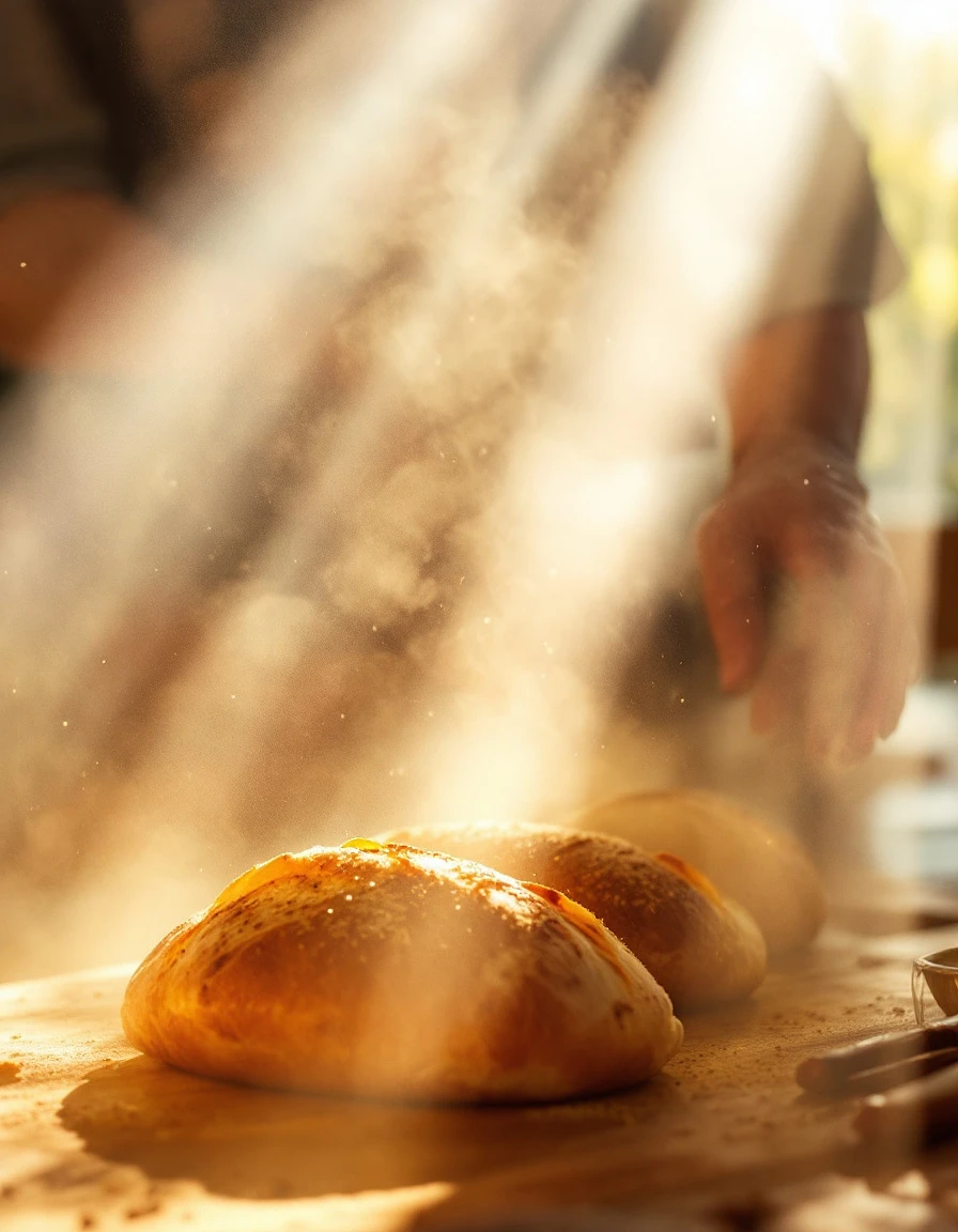 "Freshly Baked Morning" – Bakery x Art of Light and Fragrance Artistic production additional elements: Morning light, like sunlight filtering through the trees, illuminates the dusty air The baked bread shines golden, like a sacrament The background has slightly stronger shadows, emphasizing the warmth of the hands