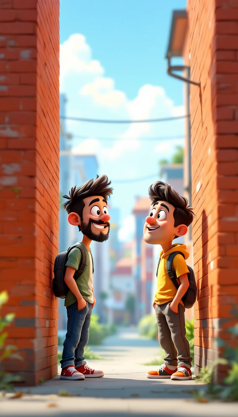 A 3D-rendered cartoon-style illustration showing two funny young Brazilian men (age 23-34) , standing on opposite sides of a thick brick wall in a playful street scene. Both looking curiously at each other. Semi-realistic 3D faces, casual colorful clothes, bright daylight background, 9:16 vertical format.