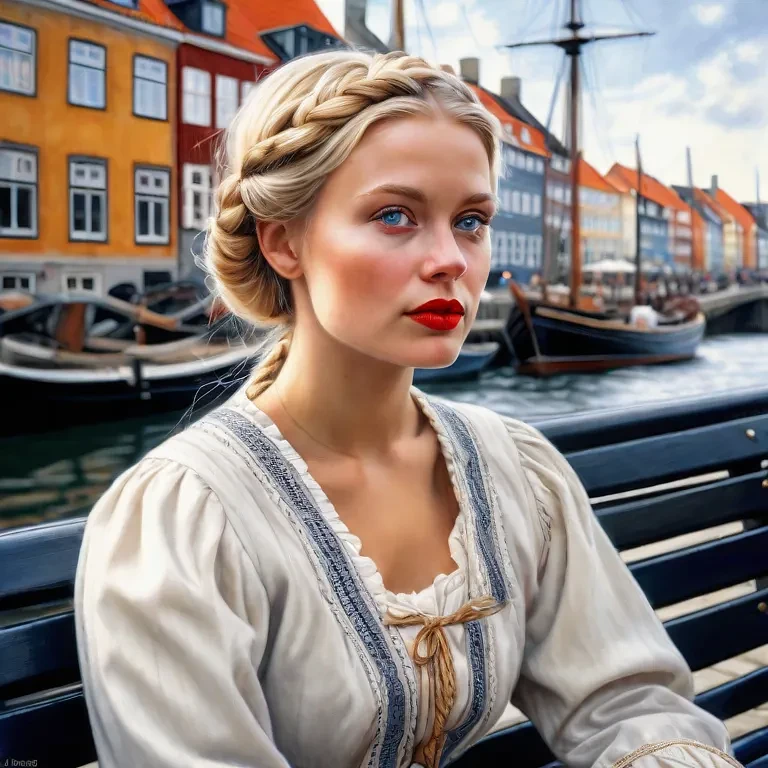 Danish girl in traditional dress in Nyhavn, Copenhagen.