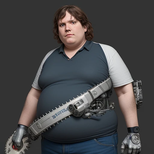 Javier Milei, 55 years old, fat, and a double chin, in his left arm was replaced by a mechanich arm as a chainsaw, like a cyborg.