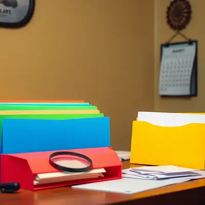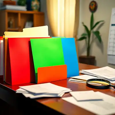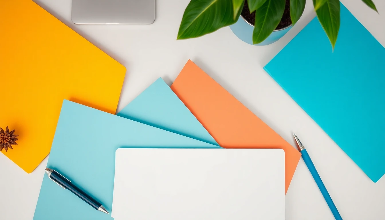 A clean, visually appealing desktop setup featuring color-coded mail folders. The folders are neatly arranged and have a modern, minimalist design. The shot is an overhead view, emphasizing the organization and system. Around the folders, include subtle elements that suggest a Martinican context: perhaps a small, local craft item, a specific type of pen popular in the region, or a glimpse of a tropical plant in the background. The lighting is bright, even, and professional, creating a sense of efficiency and calm. The image should be free of any text or labels
