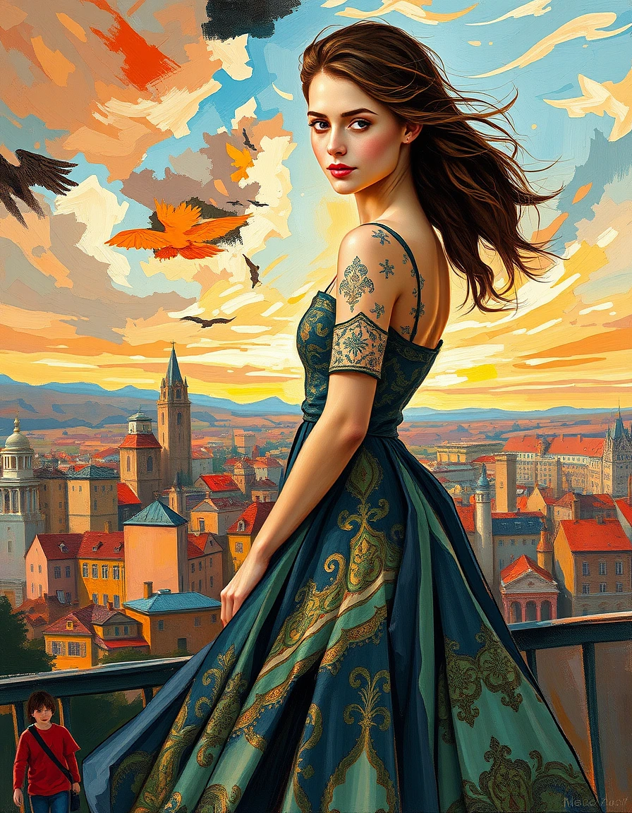 An impressionist painting of a young woman with a fashionable long dress. The woman has a vibrant and youthful face with a hint of a smile. Her long dress is adorned with intricate patterns and flows gracefully. The background of the painting is filled with a blend of warm and cool colours, with a cityscape and a dynamic sky. The style of this artwork is reminiscent of Dimitar Bogdanov, a famous impressionist artist known for his innovative and expressive techniques.