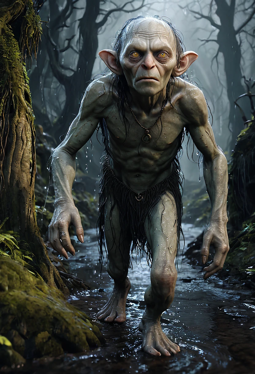 glamour shot of Gollum, Lord of rings, John Tolkien, morbide, dark, very detailed, rendered in octane, wet, dense atmospheric, epic, dramatic, empty, creepy, trail cam footage, photorealistic, hyperornate details