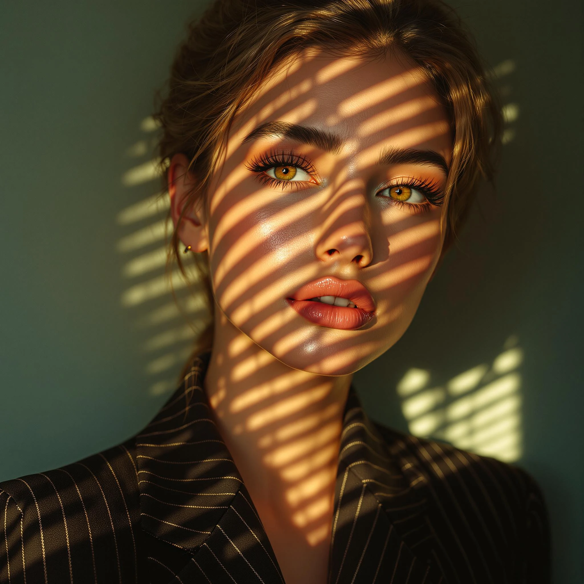 A hyperrealistic close-up portrait of a woman bathed in warm, soft afternoon light streaming through vintage Venetian blinds, creating intricate shadow patterns across her face. The lighting enhances her natural, glowing complexion, with dewy skin that reveals subtle, realistic textures. Her cheekbones are softly highlighted, her expressive eyes framed by long, delicate lashes, and a faint touch of pastel eyeshadow accentuates their depth. Her full lips, painted in a soft peach shade, add warmth to her elegant appearance. She wears a dark, pinstriped blazer, with precise details visible in the fabric, adding a refined, timeless touch. The background is a muted teal wall, subtly textured and complementing the warm, retro-inspired tones of the scene. The overall composition combines 1980s-inspired soft synthwave lighting with hyperrealistic rendering, capturing every detail—from the interplay of light and shadow on her skin to the precise weave of her blazer fabric. The aesthetic evokes a nostalgic yet sophisticated mood, blending elements of cinematic glamour and modern hyperrealism.