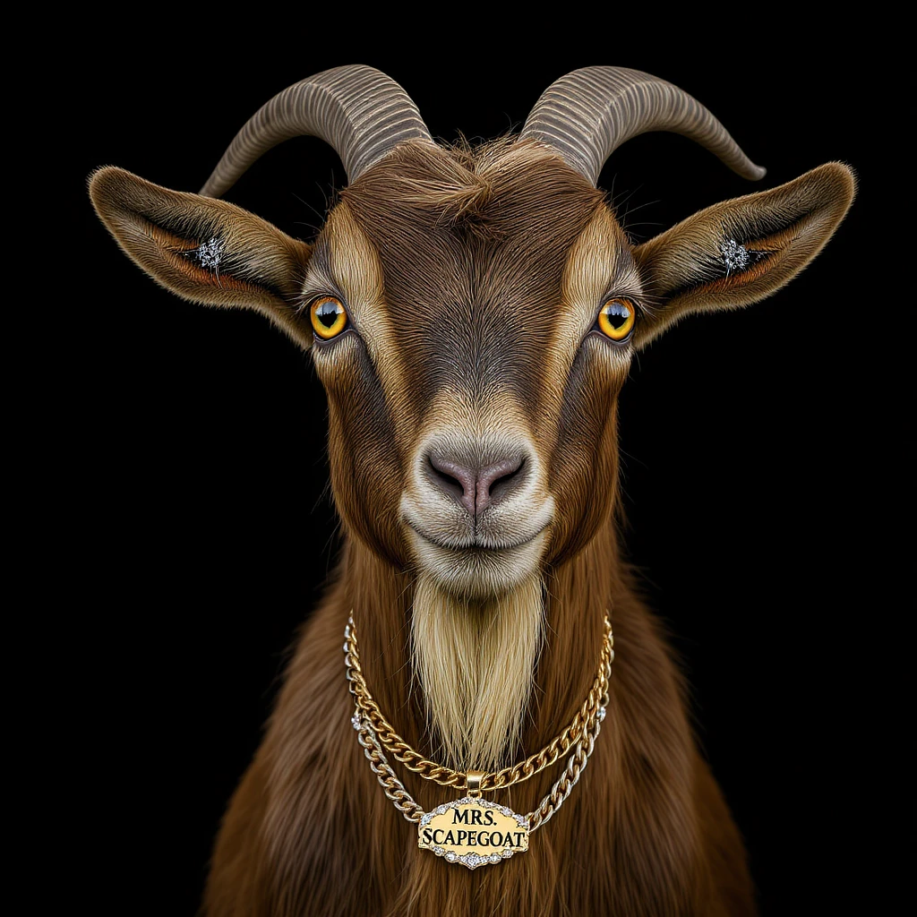 create a high-resolution image of AN URBAN BROWN HAIRED GIRL goat and detail the animal's characteristics in order to generate the image of a rare and beautiful animal. The image should show only the head and neck, focusing on the HAZEL eyes, from the front, facing the camera, with a black background, illuminating the face, showing the animal's expressive gaze. The goat should be wearing DIAMOND EARINGS AND gold chains with a diamond pendant charm with the words "MRS. SCAPEGOAT" engraved on it. The imaGEW SHOULD RESEMBLE AN ALBUM COVER. The objective of the image created is to impress with its beauty AND COOLNESS.