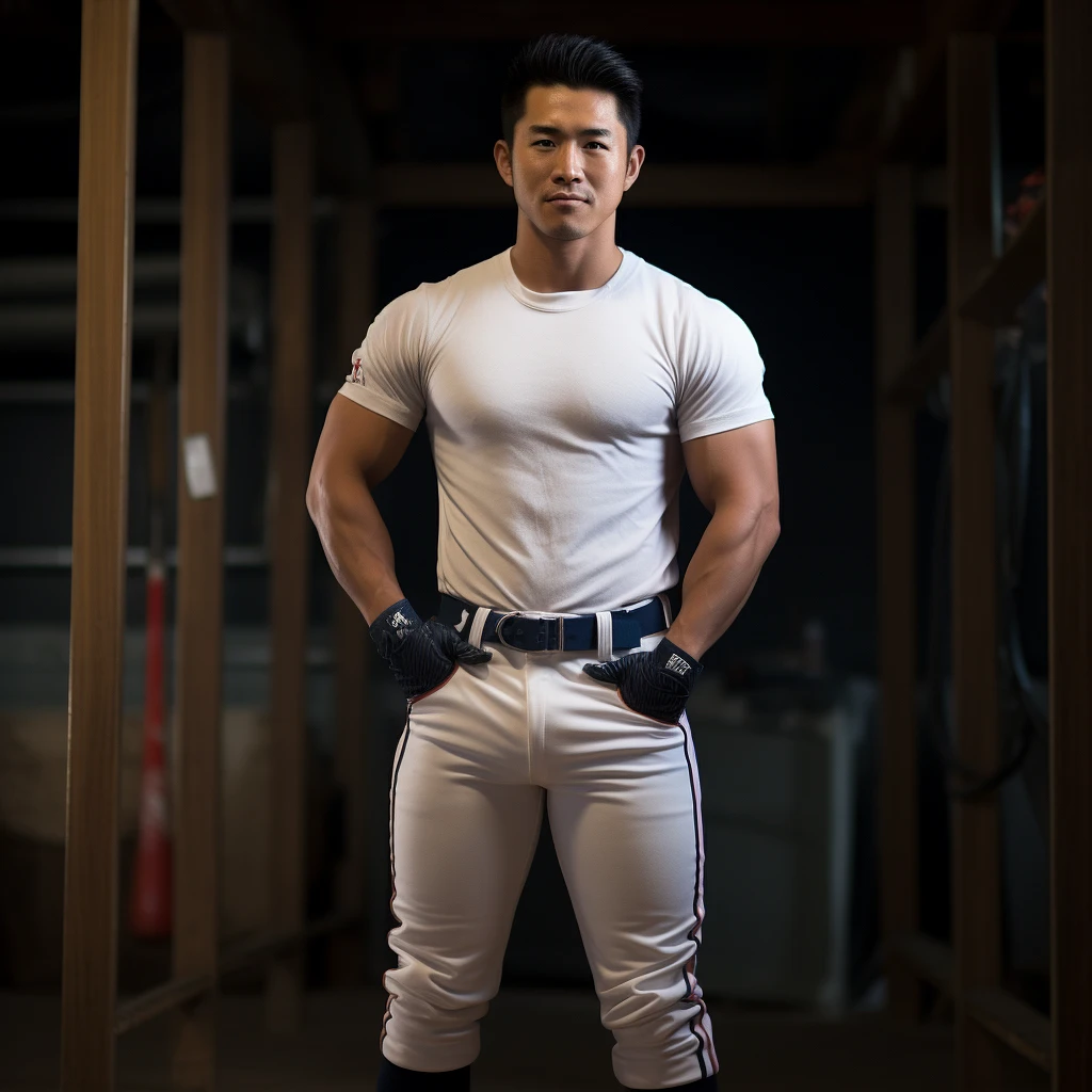 Full-Body Shot - Head-to-toe view, japanese, baseball player, handsome, show legs, show feet. standing, baseball field background