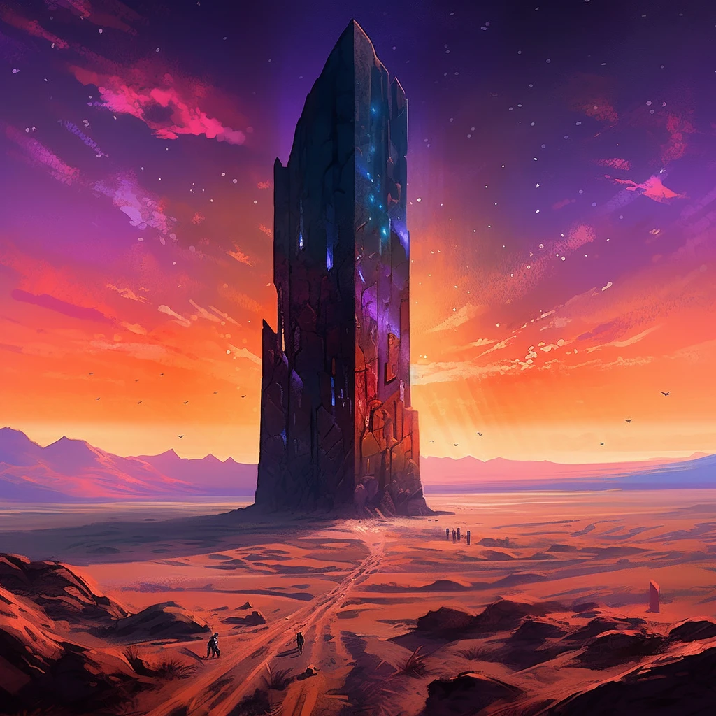 A vast desert of crystal sands under a twilight sky, its dunes refracting the dying light into a symphony of colors. In the heart of this kaleidoscopic wasteland, a towering monolith of pure obsidian stands, a mysterious relic of a forgotten civilization. Its surface is etched with ancient, cryptic glyphs that glow intermittently with an ethereal light.