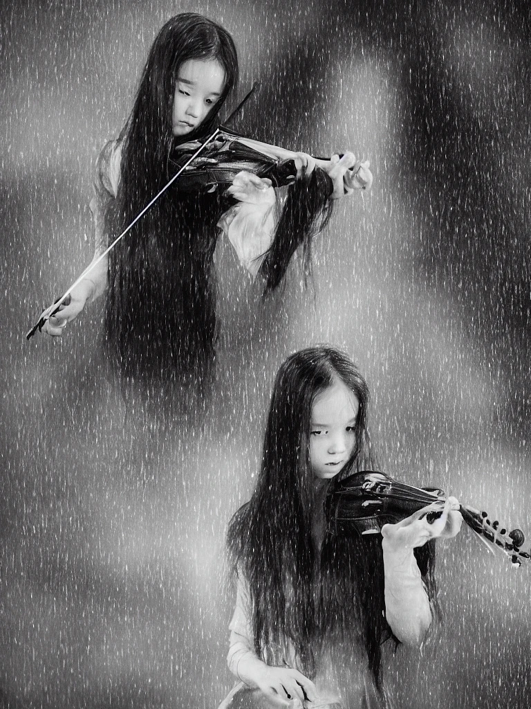 young girl with long hair playing violin instrumental, rain, night, cinematic, 8k, very intricate, Traditional Chinese Ink