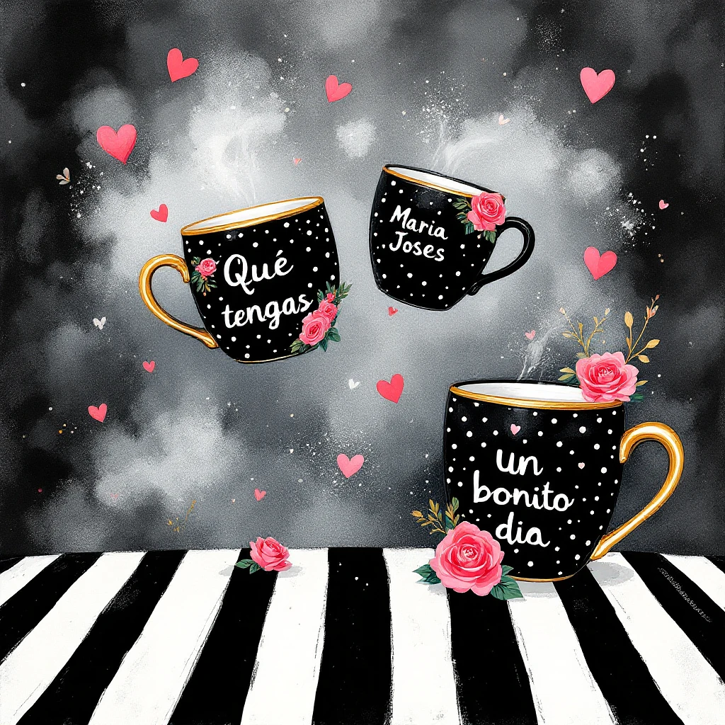 A whimsical and enchanting illustration featuring four gold-rimmed black polka dot felt mugs, each displaying a motivational phrase. 'María Jose' 'Qué tengas' and 'Un bonito día' float gracefully in mid-air, defying gravity. The background is a captivating blend of black and white hues, reminiscent of an abstract painter's palette, creating a dreamy atmosphere. The mugs are adorned with vibrant flowers, hearts, and roses, adding charm and playfulness. They rest on a striking black and white striped surface, emphasizing the visual impact and balance. This typography-inspired artwork exudes an uplifting and dreamy mood, designed to inspire positivity and motivation. The piece showcases the artist's mastery in painting, typography, and illustration, resulting in a captivating and imaginative composition, typography, painting, illustration