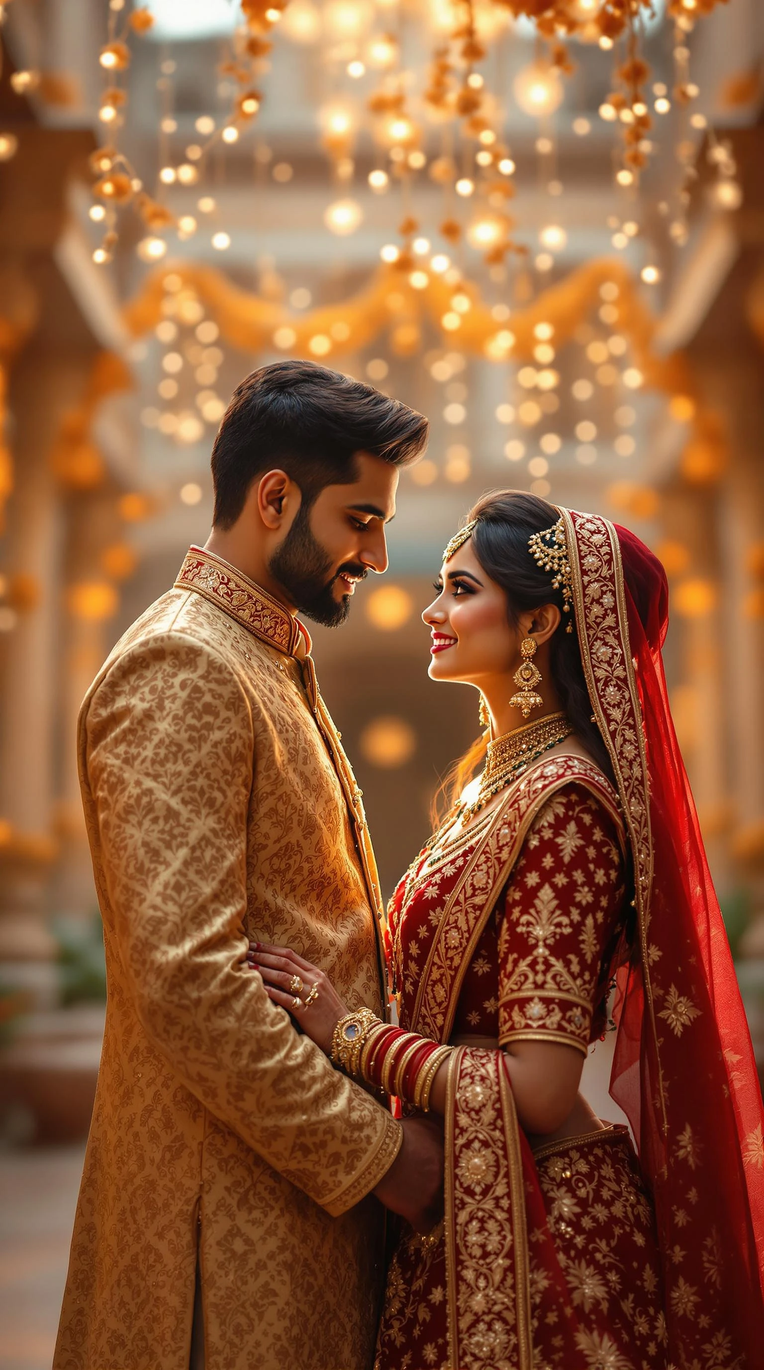 "A stunning Indian couple stands face to face, gazing deeply into each other’s eyes with love and admiration. The man, tall and charming, wears a classic sherwani with intricate golden embroidery, while the woman, graceful and elegant, is dressed in a richly embellished red lehenga with traditional jewelry glimmering under soft lighting. They stand amidst a dreamy, royal backdrop—perhaps an ancient palace courtyard adorned with marigold garlands and twinkling fairy lights. Their expressions are full of passion and tenderness, as if the world has disappeared around them. A warm golden glow highlights their faces, capturing the essence of timeless romance and Indian beauty. "