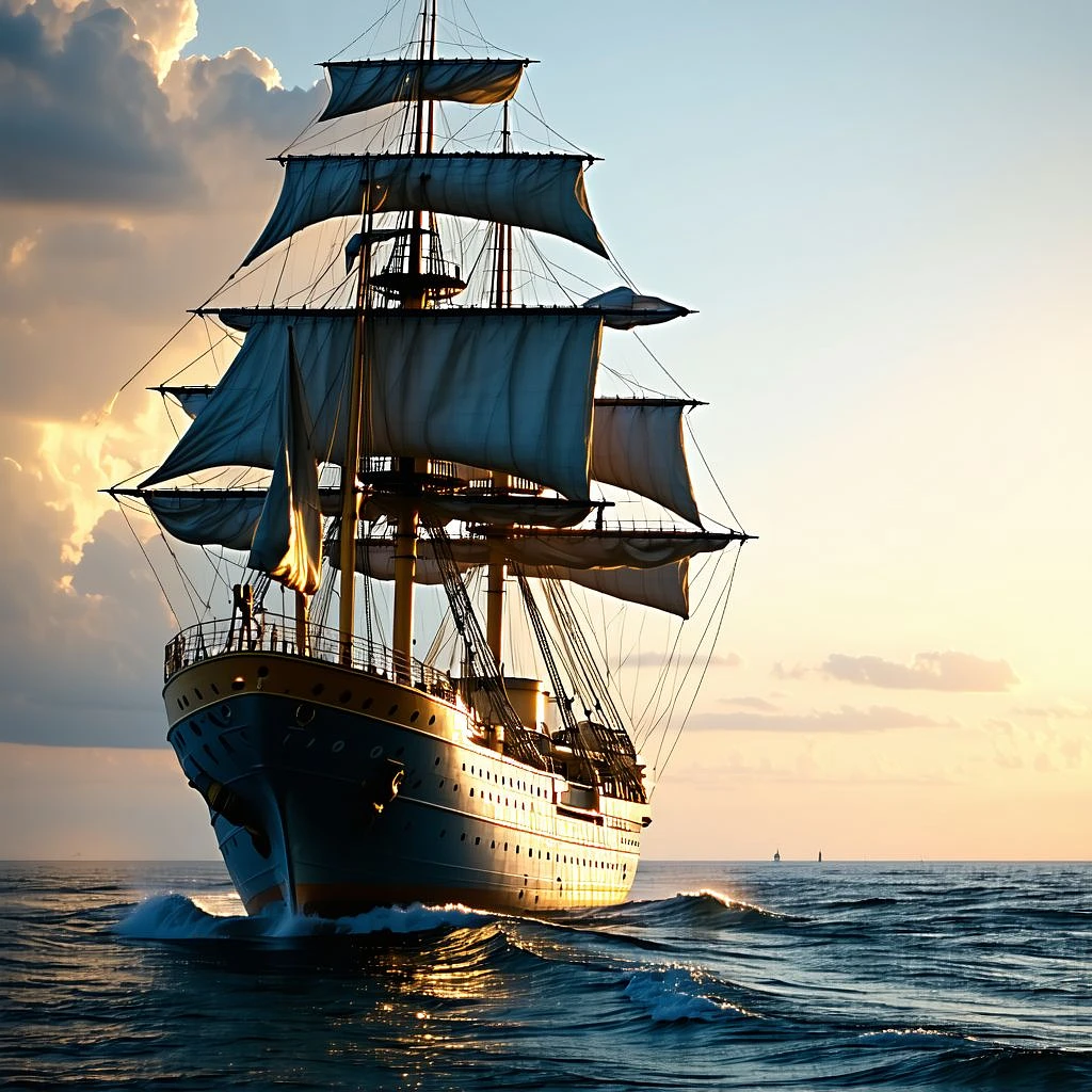 Photo of a ultra realistic sailing ship, dramatic light, pale sunrise, cinematic lighting, battered, low angle, trending on artstation, 4k, hyper realistic, focused, extreme details, unreal engine 5, cinematic, masterpiece, art by studio ghibli, intricate artwork by john william turner