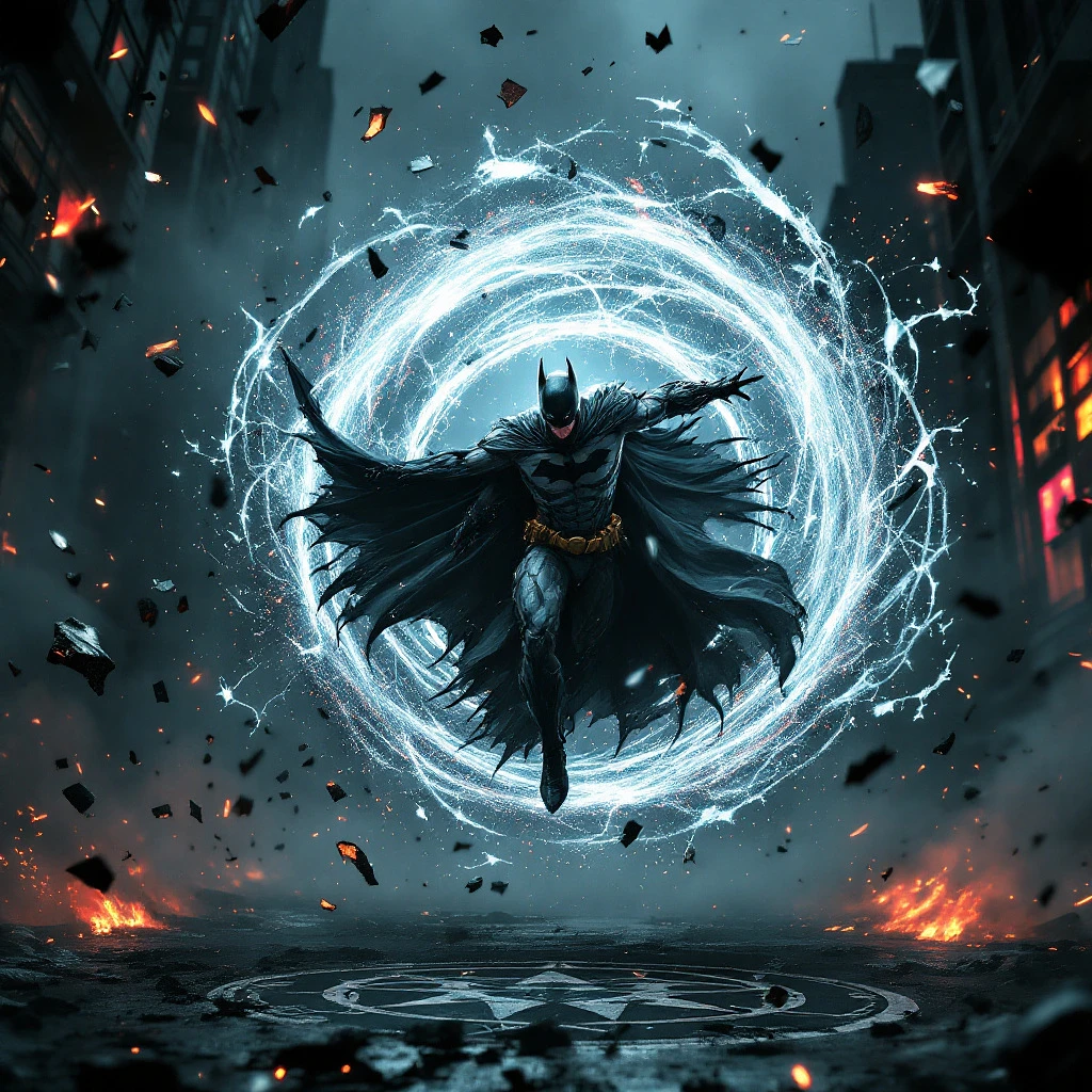 Demonic Batman with dark aura around, agressively spinning around in circle with his claws creating blasts of wind and an aura explosion, torned clothes flying in circle, wearing cybernetics enhancements, occult symbol under him on the ground, epic and dynamic composition, Ultrakill, Pragmata, dark cityscapes background, artstation, hdr, colorful shot, intricate details, cinematic, detailed, stormy weather, detailed art deco ornamentation, tons of flying debris around him", modifier="CarnageStyle", color="blood_red", intensity="1. 3"