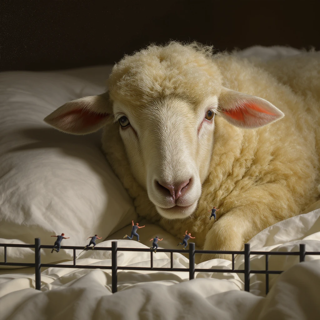 A hyper-realistic digital portrait of a sheep trying to go to sleep. In front of the sheep are mini humans jumping a fence while the sheep looks at it trying to goto sleep. The background is a bed on which the sheep is trying to sleep on. The lighting is soft but directional. The style is reminiscent of classical oil painting with meticulous detail and smooth brushwork, but created with digital tools.