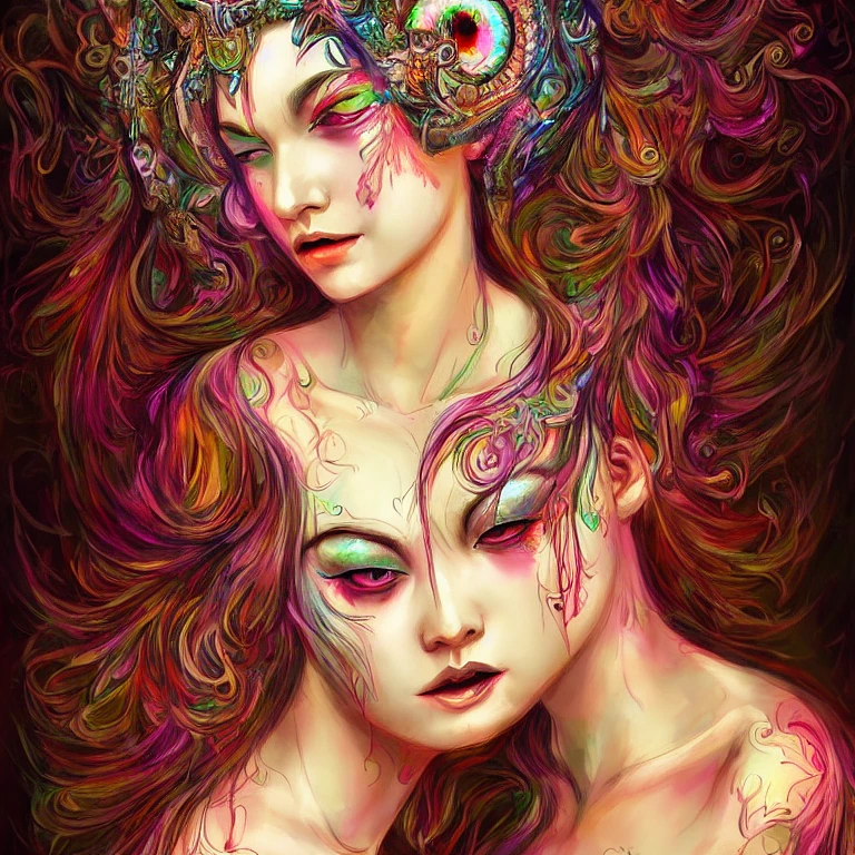 li tobler as a beautiful goddess, off-center, wanton feminine female woman desire, dead eyes, ornate, insanity, psychedelic, digital painting, concept art, smooth, sharp focus digital art