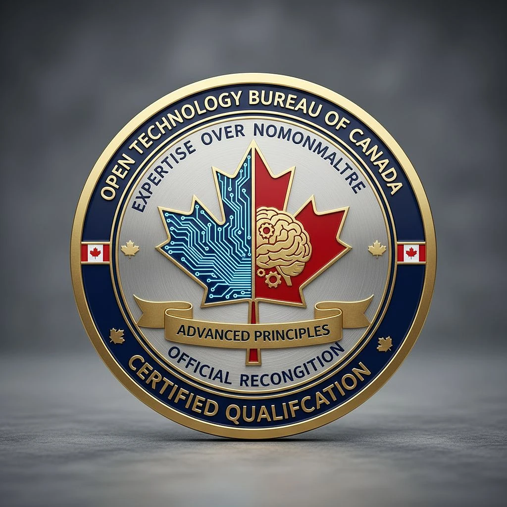Create a professional badge that signifies a qualification from the Open Technology Bureau of Canada, that demonstrates a qualification over terminology. Make sure Canadian symbolism is included. Don't use the added image.