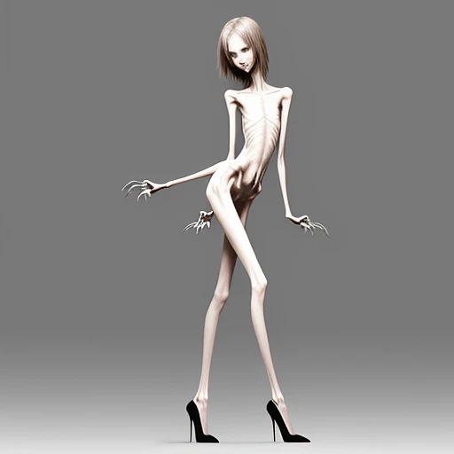 kneering position of extreme skinny slender anorexic girl very skinny slender girl, with long curved claws, skinny legs and long skinny calves in high heels ,