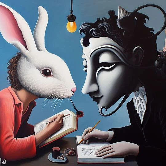 Painting, A thought-provoking and emotional portrayal of Jules engaged in conversation with a rabbit’s head, conveying his literary passion, painted in a dreamlike style reminiscent of Salvador Dalí mixed whit the tone of "black mambo" from "Glass Animals"using acrylics on canvas. –ar 16:9