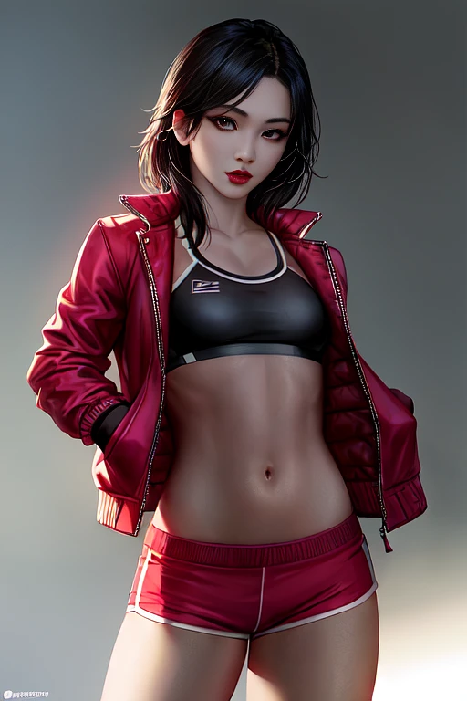 (1girl) , (full body) , Beautiful Korean girl, kpop idol, (wearing a cropped jacket, sports bra, running shorts) , (red lips) , (small breasts) , (toned stomach) , dramatic lighting, (photo realism:1.4) , symmetrical eyes, (aegyo sal:1) , (eyelashes:1.1) , (beautifully detailed face, beautiful detailed eyes) , realistic, sharp focus, HD, highly detailed, intricate, photography, hyperrealism, hyperrealistic, raytracing, physics-based rendering