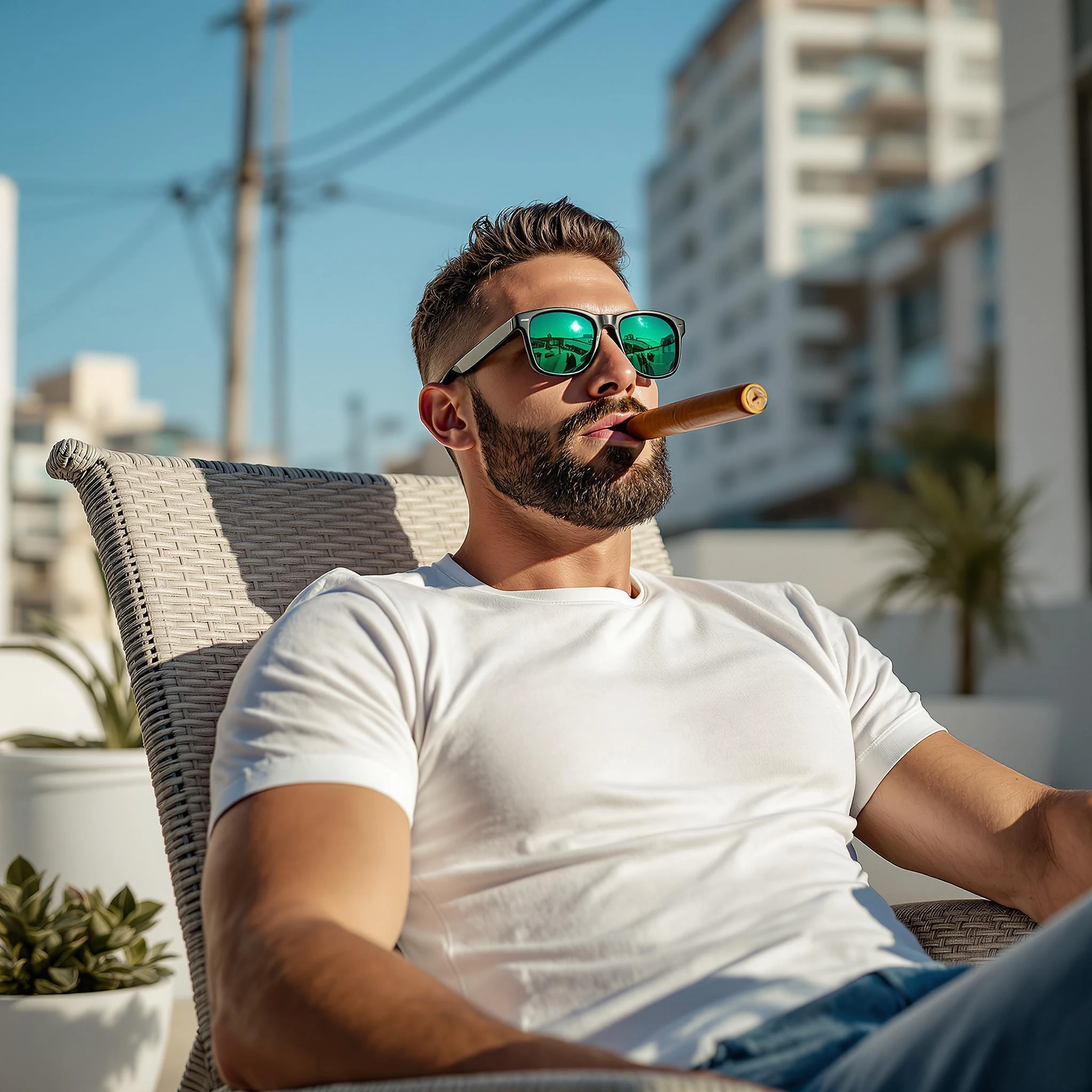 Portrait en contre-plongée d’un homme barbu, photographié en extérieur dans une lumière dorée de fin d’après-midi. Il est assis en position détendue sur un fauteuil tressé, type mobilier de terrasse, dans un décor urbain minimaliste. Il porte un t-shirt blanc ajusté et de larges lunettes de soleil à monture noire, aux verres réfléchissants vert émeraude, dans lesquels se reflètent des immeubles modernes, un ciel bleu clair, et des câbles électriques — créant une profondeur inattendue dans l’image. Sa barbe est dense, soigneusement taillée, encadrant une mâchoire solide et un profil viril. Ses cheveux sont courts, coiffés en dégradé net sur les côtés. Entre ses lèvres, il tient un cigare long, épais, avec une bague visible à mi-longueur, symbole assumé d’élégance et de caractère. L’homme dégage une impression de contrôle, de calme et de confiance nonchalante, comme figé dans un moment de plaisir suspendu. La lumière naturelle éclaire doucement la scène depuis l’arrière-plan gauche, créant un halo discret et une ambiance estivale, presque balnéaire. Une plante verte dans un pot blanc apparaît floue au premier plan, ajoutant une touche organique au décor. L’ensemble évoque un mode de vie raffiné et décontracté, mélange de virilité contemporaine, de luxe discret et d’affirmation individuelle. Le style général de la photo rappelle une campagne pour lunettes de soleil haut de gamme ou un éditorial masculin chic.