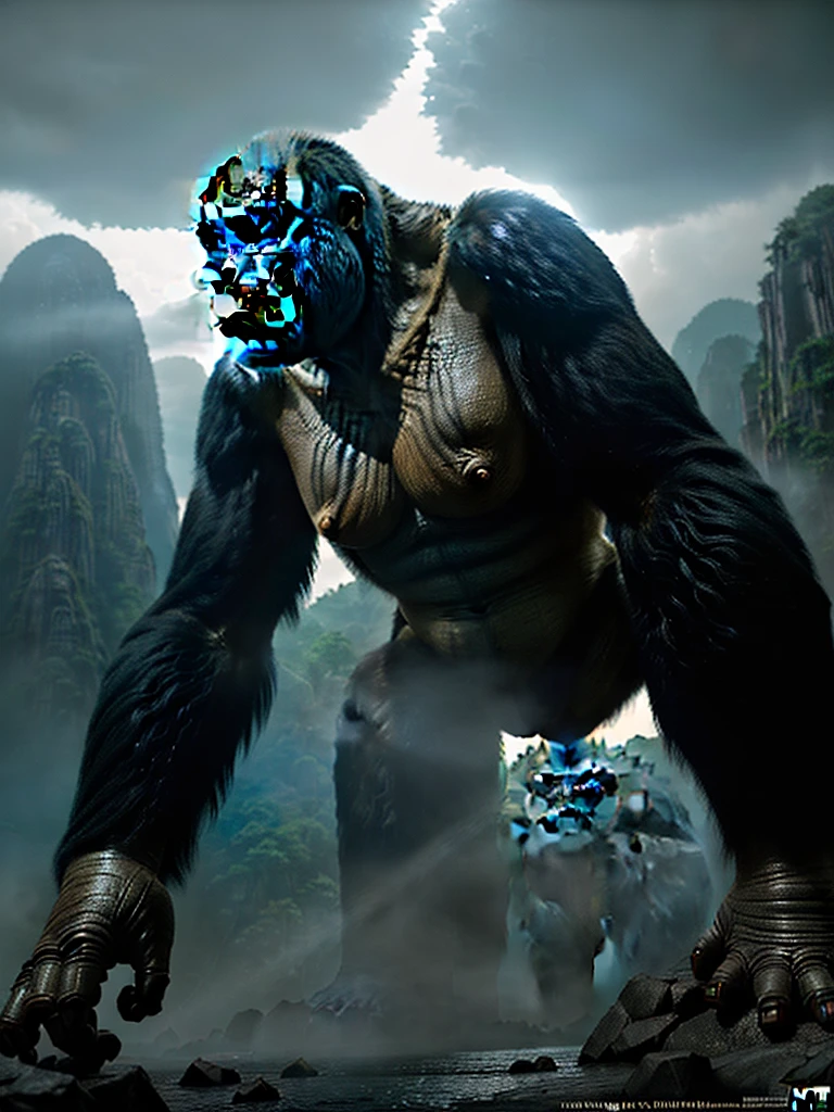 Photo of a ultra realistic King Kong movie scene, bright light, cinematic lighting, battered, low angle, trending on artstation, 8k ultra HD, hyper realistic, focused, extreme details, unreal engine 5, cinematic, masterpiece, art by studio ghibli, intricate artwork by john william turner