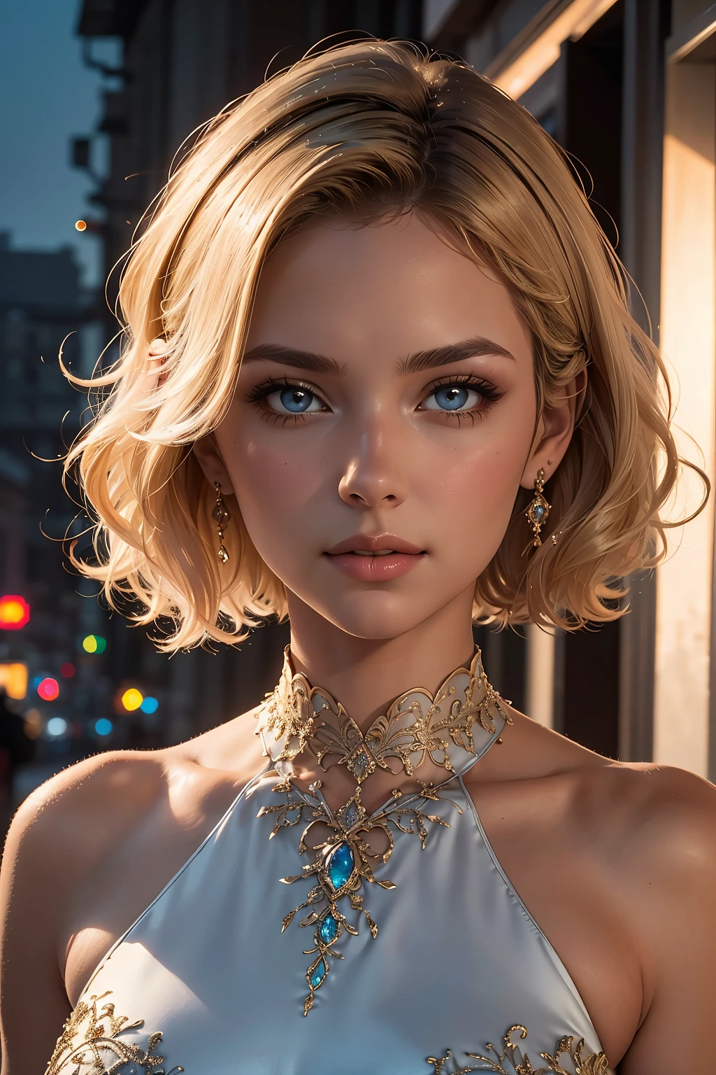 (masterpiece,official art, highest quality, etxreme detail, 8k, render, octane,best quality:1.2) , 1girl, short curly blonde hair, beautiful eyes, radiant skin, ultrarealistic, attending a party, (wearing a stunning dress:1.3)