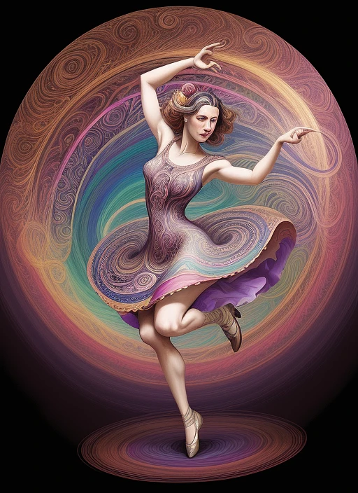 early 1900's style, a woman in a multicolored dress is dancing with a swirly background and a circular design behind her, , Fabien Charuau, arabesque, highly detailed digital painting, an airbrush painting