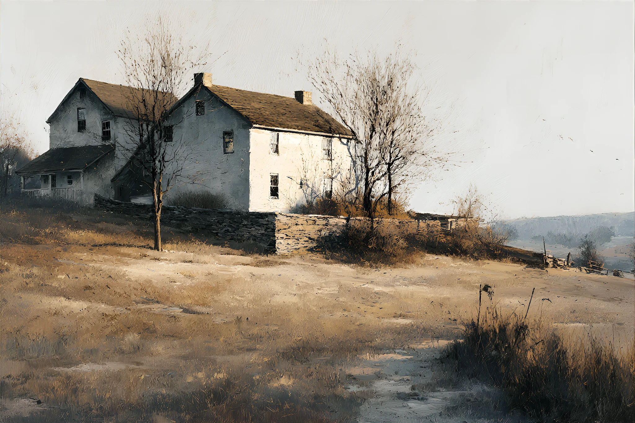 serene scene featuring a countryside farm in the morning, with a muted color palette and drybrush techniques to create a sense of tranquility