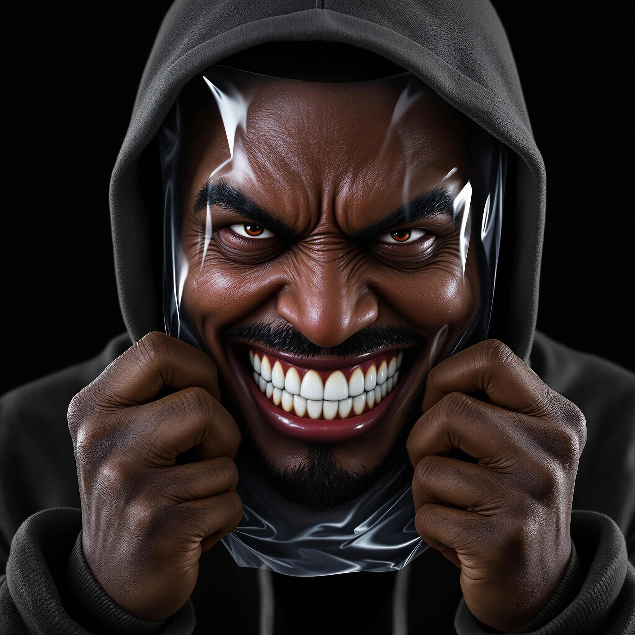 crazed angry looking african american man with a hoodie and dark eyes holding a plastic full face mask up to his face with both hands that has his same face but happy and smiling showing a lot of teeth. The image should show the full mask and some of the angry face behind it. cinematic, hyper realism, high detail, 3d illustration, 8k